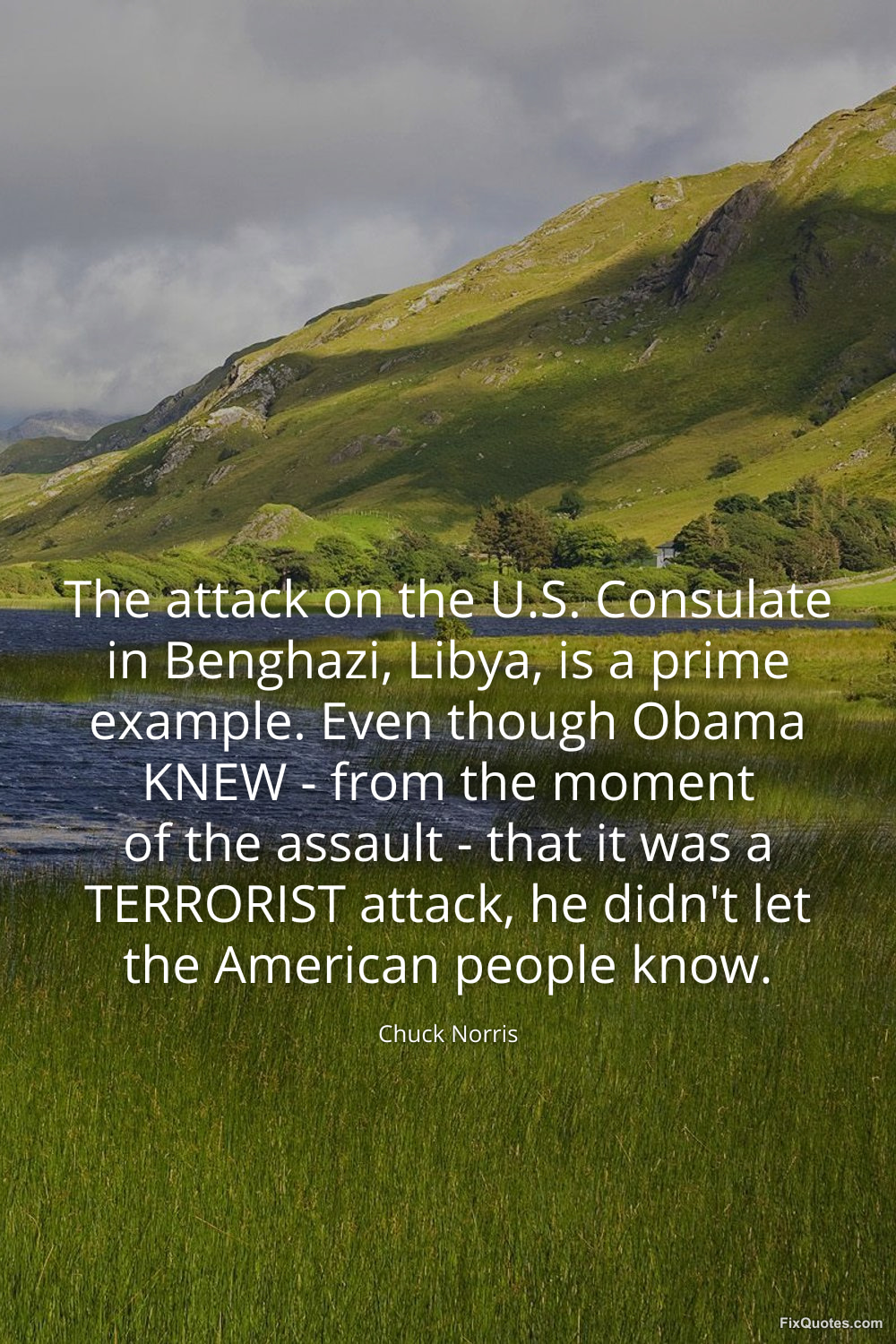 Norris, Chuck. "The attack on the U.S. Consulate in Benghazi, Libya, is a prime example. Even though Obama KNEW - from the moment of the assault - that it was a TERRORIST attack, he didn't let the American people know." FixQuotes. March 20, 2026. https://fixquotes.com/quotes/the-attack-on-the-us-consulate-in-benghazi-libya-186232/.