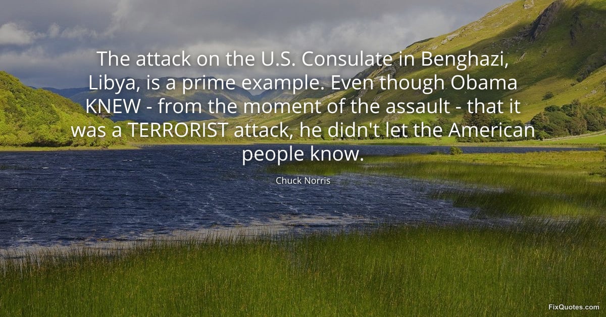 Norris, Chuck. (2026, March 20). The attack on the U.S. Consulate in Benghazi, Libya, is a prime example. Even though Obama KNEW - from the moment of the assault - that it was a TERRORIST attack, he didn't let the American people know. FixQuotes. https://fixquotes.com/quotes/the-attack-on-the-us-consulate-in-benghazi-libya-186232/