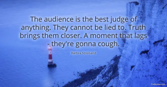 Streisand, Barbra. "The audience is the best judge of anything. They cannot be lied to. Truth brings them closer. A moment that lags - they're gonna cough." FixQuotes. January 17, 2026. https://fixquotes.com/quotes/the-audience-is-the-best-judge-of-anything-they-44633/.