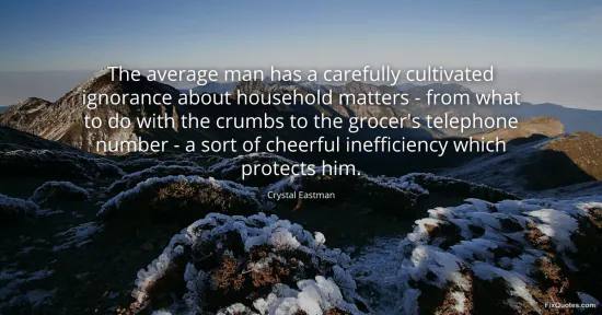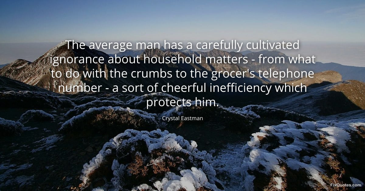 Eastman, Crystal. (2026, January 17). The average man has a carefully cultivated ignorance about household matters - from what to do with the crumbs to the grocer's telephone number - a sort of cheerful inefficiency which protects him. FixQuotes. https://fixquotes.com/quotes/the-average-man-has-a-carefully-cultivated-43970/
