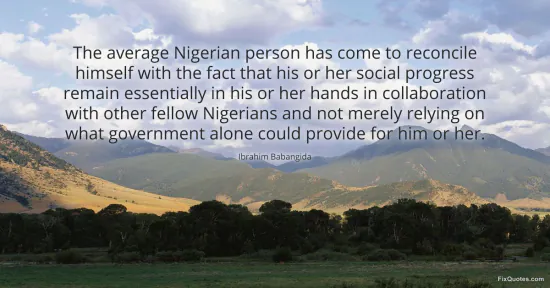 Babangida, Ibrahim. "The average Nigerian person has come to reconcile himself with the fact that his or her social progress remain essentially in his or her hands in collaboration with other fellow Nigerians and not merely relying on what government alone could provide for him or her." FixQuotes. January 15, 2026. https://fixquotes.com/quotes/the-average-nigerian-person-has-come-to-reconcile-153452/.