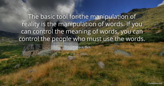 Dick, Philip K. (2026, January 15). The basic tool for the manipulation of reality is the manipulation of words. If you can control the meaning of words, you can control the people who must use the words. FixQuotes. https://fixquotes.com/quotes/the-basic-tool-for-the-manipulation-of-reality-is-62597/