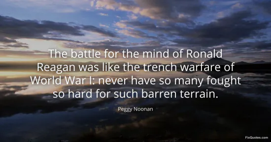 Noonan, Peggy. "The battle for the mind of Ronald Reagan was like the trench warfare of World War I: never have so many fought so hard for such barren terrain." FixQuotes. February 10, 2026. https://fixquotes.com/quotes/the-battle-for-the-mind-of-ronald-reagan-was-like-80518/.