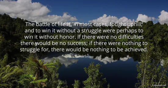 Smiles, Samuel. (2026, January 17). The battle of life is, in most cases, fought uphill; and to win it without a struggle were perhaps to win it without honor. If there were no difficulties there would be no success; if there were nothing to struggle for, there would be nothing to be achieved. FixQuotes. https://fixquotes.com/quotes/the-battle-of-life-is-in-most-cases-fought-uphill-38057/