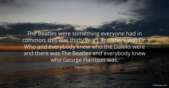 Hitchcock, Robyn. (2026, January 15). The Beatles were something everyone had in common; this was thirty years ago, there was Dr. Who and everybody knew who the Daleks were and there was The Beatles and everybody knew who George Harrison was. FixQuotes. https://fixquotes.com/quotes/the-beatles-were-something-everyone-had-in-common-152214/