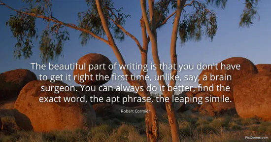 Cormier, Robert. (2026, January 16). The beautiful part of writing is that you don't have to get it right the first time, unlike, say, a brain surgeon. You can always do it better, find the exact word, the apt phrase, the leaping simile. FixQuotes. https://fixquotes.com/quotes/the-beautiful-part-of-writing-is-that-you-dont-134561/