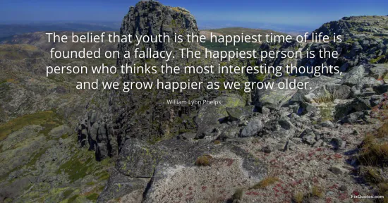 Phelps, William Lyon. (2026, January 15). The belief that youth is the happiest time of life is founded on a fallacy. The happiest person is the person who thinks the most interesting thoughts, and we grow happier as we grow older. FixQuotes. https://fixquotes.com/quotes/the-belief-that-youth-is-the-happiest-time-of-64120/