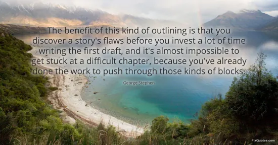 Stephen, George. "The benefit of this kind of outlining is that you discover a story's flaws before you invest a lot of time writing the first draft, and it's almost impossible to get stuck at a difficult chapter, because you've already done the work to push through those kinds of blocks." FixQuotes. January 16, 2026. https://fixquotes.com/quotes/the-benefit-of-this-kind-of-outlining-is-that-you-105129/.