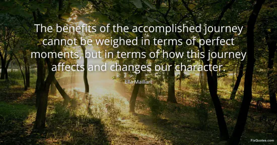 Maillart, Ella. "The benefits of the accomplished journey cannot be weighed in terms of perfect moments, but in terms of how this journey affects and changes our character." FixQuotes. January 17, 2026. https://fixquotes.com/quotes/the-benefits-of-the-accomplished-journey-cannot-50089/.