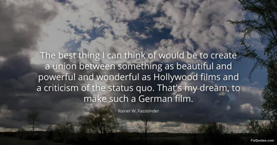 Fassbinder, Rainer W. "The best thing I can think of would be to create a union between something as beautiful and powerful and wonderful as Hollywood films and a criticism of the status quo. That's my dream, to make such a German film." FixQuotes. January 15, 2026. https://fixquotes.com/quotes/the-best-thing-i-can-think-of-would-be-to-create-165679/.