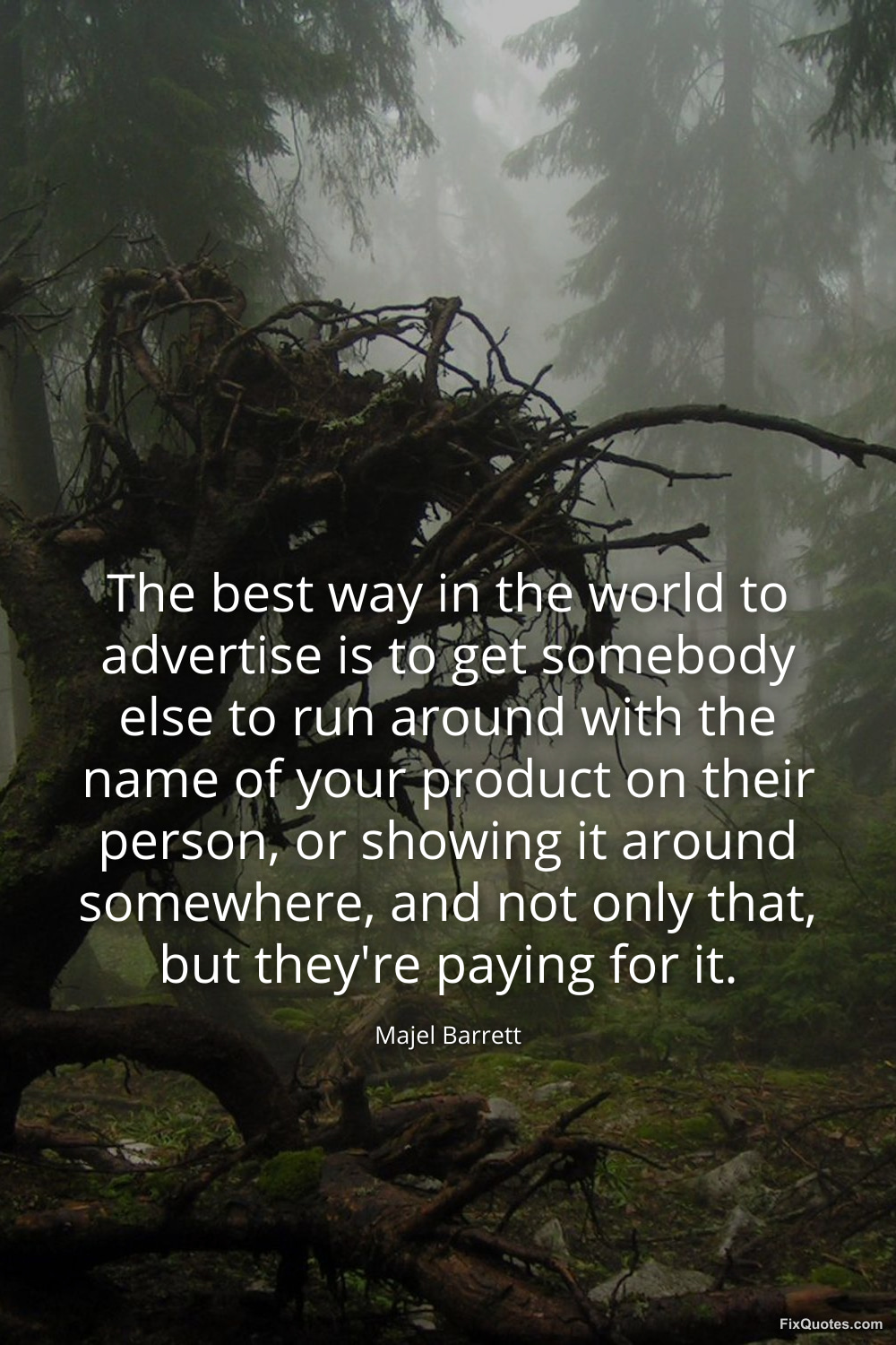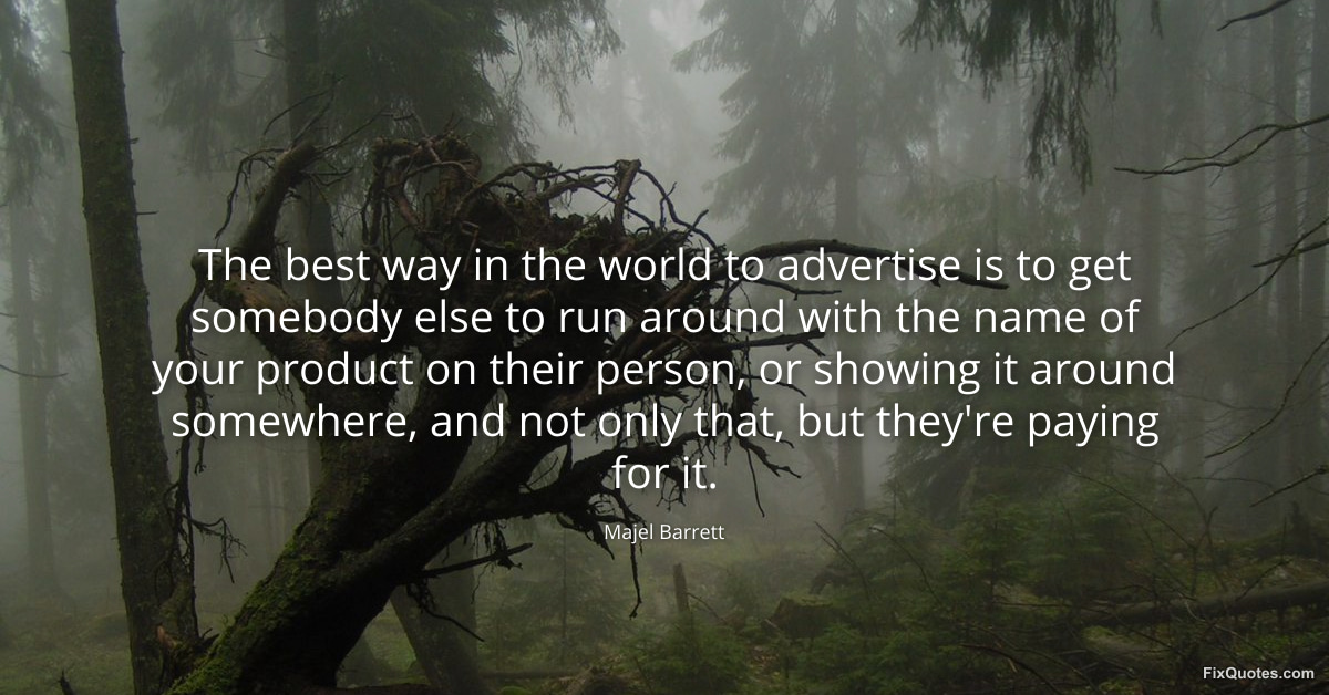Barrett, Majel. (2026, February 19). The best way in the world to advertise is to get somebody else to run around with the name of your product on their person, or showing it around somewhere, and not only that, but they're paying for it. FixQuotes. https://fixquotes.com/quotes/the-best-way-in-the-world-to-advertise-is-to-get-49283/