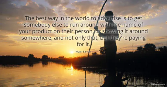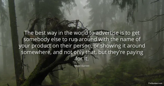 Barrett, Majel. "The best way in the world to advertise is to get somebody else to run around with the name of your product on their person, or showing it around somewhere, and not only that, but they're paying for it." FixQuotes. February 19, 2026. https://fixquotes.com/quotes/the-best-way-in-the-world-to-advertise-is-to-get-49283/.