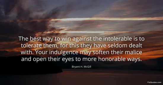 McGill, Bryant H. "The best way to win against the intolerable is to tolerate them, for this they have seldom dealt with. Your indulgence may soften their malice and open their eyes to more honorable ways." FixQuotes. January 17, 2026. https://fixquotes.com/quotes/the-best-way-to-win-against-the-intolerable-is-to-43767/.