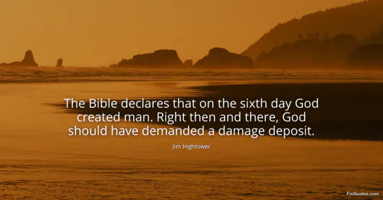 Hightower, Jim. (2026, January 16). The Bible declares that on the sixth day God created man. Right then and there, God should have demanded a damage deposit. FixQuotes. https://fixquotes.com/quotes/the-bible-declares-that-on-the-sixth-day-god-89831/