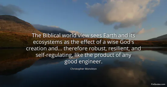 Monckton, Christopher. "The Biblical world view sees Earth and its ecosystems as the effect of a wise God's creation and... therefore robust, resilient, and self-regulating, like the product of any good engineer." FixQuotes. January 15, 2026. https://fixquotes.com/quotes/the-biblical-world-view-sees-earth-and-its-170902/.