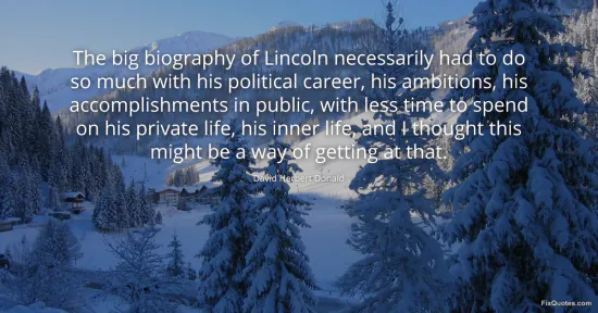 Donald, David Herbert. "The big biography of Lincoln necessarily had to do so much with his political career, his ambitions, his accomplishments in public, with less time to spend on his private life, his inner life, and I thought this might be a way of getting at that." FixQuotes. January 17, 2026. https://fixquotes.com/quotes/the-big-biography-of-lincoln-necessarily-had-to-47250/.