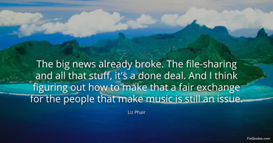 Phair, Liz. "The big news already broke. The file-sharing and all that stuff, it's a done deal. And I think figuring out how to make that a fair exchange for the people that make music is still an issue." FixQuotes. January 17, 2026. https://fixquotes.com/quotes/the-big-news-already-broke-the-file-sharing-and-81723/.