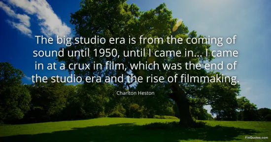 Heston, Charlton. (2026, January 15). The big studio era is from the coming of sound until 1950, until I came in... I came in at a crux in film, which was the end of the studio era and the rise of filmmaking. FixQuotes. https://fixquotes.com/quotes/the-big-studio-era-is-from-the-coming-of-sound-167176/