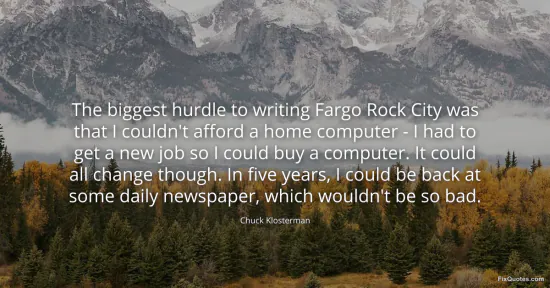 Klosterman, Chuck. "The biggest hurdle to writing Fargo Rock City was that I couldn't afford a home computer - I had to get a new job so I could buy a computer. It could all change though. In five years, I could be back at some daily newspaper, which wouldn't be so bad." FixQuotes. January 17, 2026. https://fixquotes.com/quotes/the-biggest-hurdle-to-writing-fargo-rock-city-was-48126/.