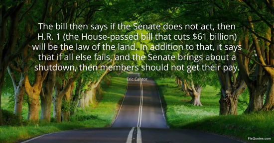 Cantor, Eric. (2026, January 17). The bill then says if the Senate does not act, then H.R. 1 (the House-passed bill that cuts $61 billion) will be the law of the land. In addition to that, it says that if all else fails, and the Senate brings about a shutdown, then members should not get their pay. FixQuotes. https://fixquotes.com/quotes/the-bill-then-says-if-the-senate-does-not-act-57352/