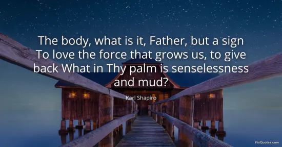 Shapiro, Karl. "The body, what is it, Father, but a sign To love the force that grows us, to give back What in Thy palm is senselessness and mud?" FixQuotes. January 15, 2026. https://fixquotes.com/quotes/the-body-what-is-it-father-but-a-sign-to-love-the-156473/.