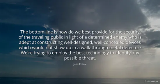 Pistole, John. (2026, January 16). The bottom line is how do we best provide for the security of the traveling public in light of a determined enemy who is adept at constructing well-designed, well-concealed devices which would not show up in a walk-through metal detector? We're trying to employ the best technology to identify any possible threat. FixQuotes. https://fixquotes.com/quotes/the-bottom-line-is-how-do-we-best-provide-for-the-133558/