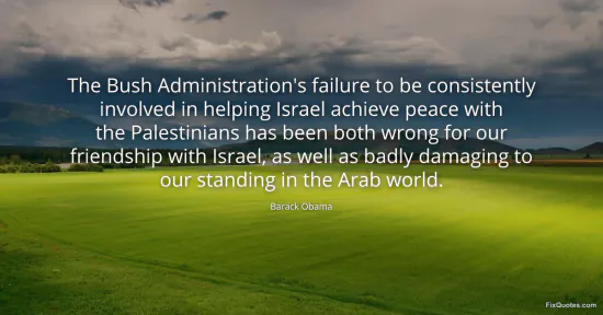 Obama, Barack. "The Bush Administration's failure to be consistently involved in helping Israel achieve peace with the Palestinians has been both wrong for our friendship with Israel, as well as badly damaging to our standing in the Arab world." FixQuotes. January 17, 2026. https://fixquotes.com/quotes/the-bush-administrations-failure-to-be-42083/.