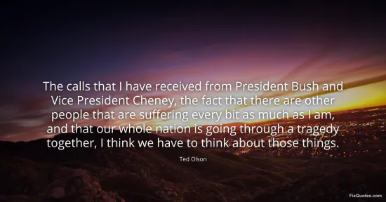 Olson, Ted. "The calls that I have received from President Bush and Vice President Cheney, the fact that there are other people that are suffering every bit as much as I am, and that our whole nation is going through a tragedy together, I think we have to think about those things." FixQuotes. January 15, 2026. https://fixquotes.com/quotes/the-calls-that-i-have-received-from-president-107629/.