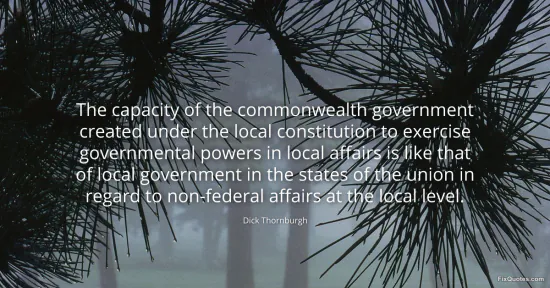 Thornburgh, Dick. "The capacity of the commonwealth government created under the local constitution to exercise governmental powers in local affairs is like that of local government in the states of the union in regard to non-federal affairs at the local level." FixQuotes. January 17, 2026. https://fixquotes.com/quotes/the-capacity-of-the-commonwealth-government-53201/.