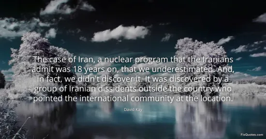 Kay, David. "The case of Iran, a nuclear program that the Iranians admit was 18 years on, that we underestimated. And, in fact, we didn't discover it. It was discovered by a group of Iranian dissidents outside the country who pointed the international community at the location." FixQuotes. January 17, 2026. https://fixquotes.com/quotes/the-case-of-iran-a-nuclear-program-that-the-58892/.