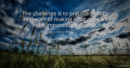 Clinton, Hillary. (2026, January 18). The challenge is to practice politics as the art of making what appears to be impossible, possible. FixQuotes. https://fixquotes.com/quotes/the-challenge-is-to-practice-politics-as-the-art-20021/