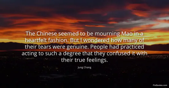 Chang, Jung. "The Chinese seemed to be mourning Mao in a heartfelt fashion. But I wondered how many of their tears were genuine. People had practiced acting to such a degree that they confused it with their true feelings." FixQuotes. January 15, 2026. https://fixquotes.com/quotes/the-chinese-seemed-to-be-mourning-mao-in-a-98790/.