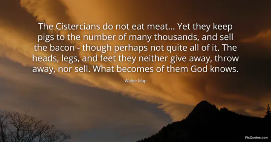 Map, Walter. (2026, January 16). The Cistercians do not eat meat... Yet they keep pigs to the number of many thousands, and sell the bacon - though perhaps not quite all of it. The heads, legs, and feet they neither give away, throw away, nor sell. What becomes of them God knows. FixQuotes. https://fixquotes.com/quotes/the-cistercians-do-not-eat-meat-yet-they-keep-122875/