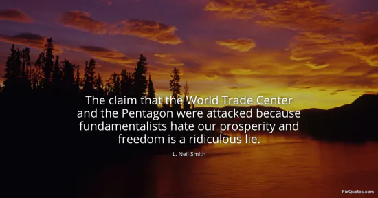 Smith, L. Neil. "The claim that the World Trade Center and the Pentagon were attacked because fundamentalists hate our prosperity and freedom is a ridiculous lie." FixQuotes. January 15, 2026. https://fixquotes.com/quotes/the-claim-that-the-world-trade-center-and-the-164120/.
