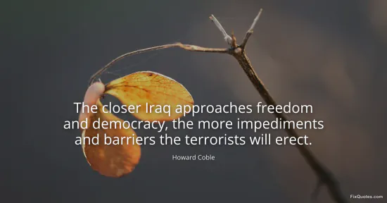 Coble, Howard. "The closer Iraq approaches freedom and democracy, the more impediments and barriers the terrorists will erect." FixQuotes. January 17, 2026. https://fixquotes.com/quotes/the-closer-iraq-approaches-freedom-and-democracy-54594/.