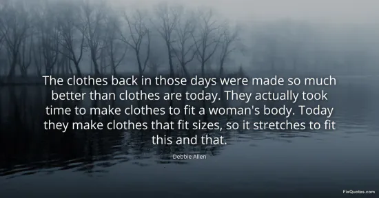 Allen, Debbie. "The clothes back in those days were made so much better than clothes are today. They actually took time to make clothes to fit a woman's body. Today they make clothes that fit sizes, so it stretches to fit this and that." FixQuotes. January 17, 2026. https://fixquotes.com/quotes/the-clothes-back-in-those-days-were-made-so-much-50987/.