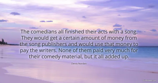 Norden, Denis. "The comedians all finished their acts with a song. They would get a certain amount of money from the song publishers and would use that money to pay the writers. None of them paid very much for their comedy material, but it all added up." FixQuotes. January 17, 2026. https://fixquotes.com/quotes/the-comedians-all-finished-their-acts-with-a-song-58487/.