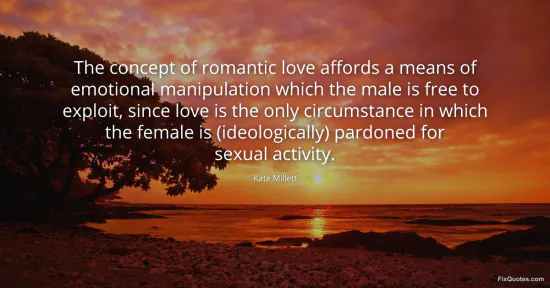Millett, Kate. "The concept of romantic love affords a means of emotional manipulation which the male is free to exploit, since love is the only circumstance in which the female is (ideologically) pardoned for sexual activity." FixQuotes. January 15, 2026. https://fixquotes.com/quotes/the-concept-of-romantic-love-affords-a-means-of-165310/.