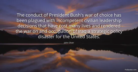 Olver, John. (2026, January 17). The conduct of President Bush's war of choice has been plagued with incompetent civilian leadership decisions that have cost many lives and rendered the war on and occupation of Iraq a strategic policy disaster for the United States. FixQuotes. https://fixquotes.com/quotes/the-conduct-of-president-bushs-war-of-choice-has-62076/