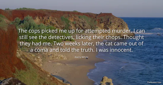 White, Barry. "The cops picked me up for attempted murder. I can still see the detectives, licking their chops. Thought they had me. Two weeks later, the cat came out of a coma and told the truth. I was innocent." FixQuotes. January 16, 2026. https://fixquotes.com/quotes/the-cops-picked-me-up-for-attempted-murder-i-can-100867/.
