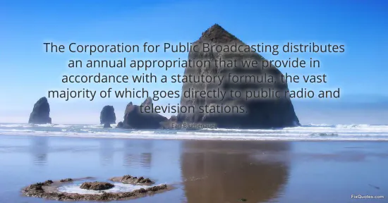 "The Corporation for Public Broadcasting distributes an annual appropriation that we provide in accordance with a statutory formula, the vast majority of which goes directly to public radio and television stations." FixQuotes, 17 Jan. 2026, https://fixquotes.com/quotes/the-corporation-for-public-broadcasting-52458/. Accessed 12 Feb. 2026.