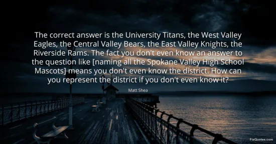 Shea, Matt. "The correct answer is the University Titans, the West Valley Eagles, the Central Valley Bears, the East Valley Knights, the Riverside Rams. The fact you don't even know an answer to the question like [naming all the Spokane Valley High School Mascots] means you don't even know the district. How can you represent the district if you don't even know it?" FixQuotes. February 9, 2026. https://fixquotes.com/quotes/the-correct-answer-is-the-university-titans-the-185011/.