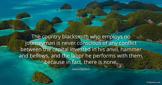 Stanford, Leland. "The country blacksmith who employs no journeyman is never conscious of any conflict between the capital invested in his anvil, hammer and bellows, and the labor he performs with them, because in fact, there is none." FixQuotes. January 15, 2026. https://fixquotes.com/quotes/the-country-blacksmith-who-employs-no-journeyman-155293/.
