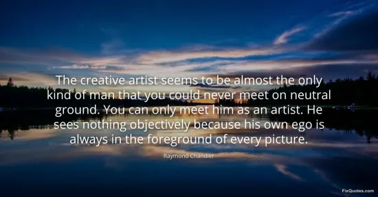 Chandler, Raymond. (2026, January 16). The creative artist seems to be almost the only kind of man that you could never meet on neutral ground. You can only meet him as an artist. He sees nothing objectively because his own ego is always in the foreground of every picture. FixQuotes. https://fixquotes.com/quotes/the-creative-artist-seems-to-be-almost-the-only-96850/