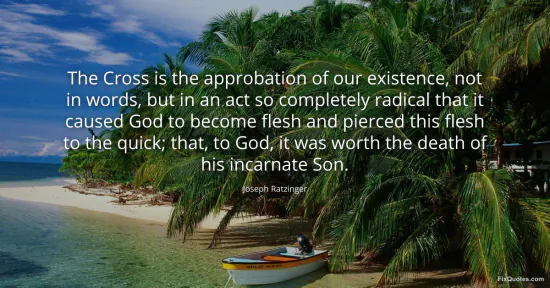 Ratzinger, Joseph. "The Cross is the approbation of our existence, not in words, but in an act so completely radical that it caused God to become flesh and pierced this flesh to the quick; that, to God, it was worth the death of his incarnate Son." FixQuotes. March 8, 2026. https://fixquotes.com/quotes/the-cross-is-the-approbation-of-our-existence-not-114313/.