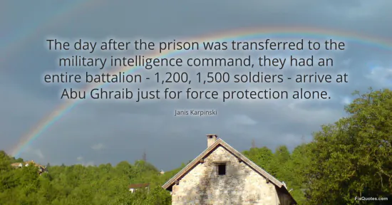 Karpinski, Janis. "The day after the prison was transferred to the military intelligence command, they had an entire battalion - 1,200, 1,500 soldiers - arrive at Abu Ghraib just for force protection alone." FixQuotes. January 16, 2026. https://fixquotes.com/quotes/the-day-after-the-prison-was-transferred-to-the-109584/.