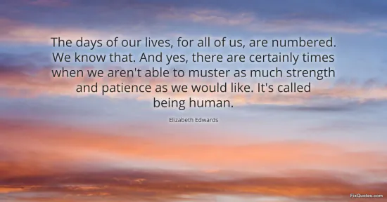 Edwards, Elizabeth. "The days of our lives, for all of us, are numbered. We know that. And yes, there are certainly times when we aren't able to muster as much strength and patience as we would like. It's called being human." FixQuotes. January 17, 2026. https://fixquotes.com/quotes/the-days-of-our-lives-for-all-of-us-are-numbered-51370/.