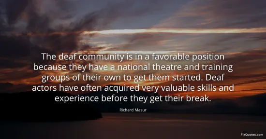Masur, Richard. (2026, January 16). The deaf community is in a favorable position because they have a national theatre and training groups of their own to get them started. Deaf actors have often acquired very valuable skills and experience before they get their break. FixQuotes. https://fixquotes.com/quotes/the-deaf-community-is-in-a-favorable-position-123257/