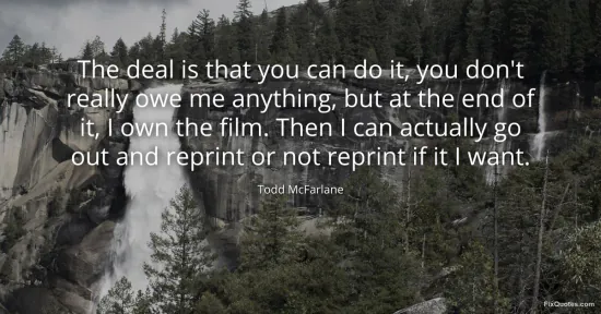 McFarlane, Todd. "The deal is that you can do it, you don't really owe me anything, but at the end of it, I own the film. Then I can actually go out and reprint or not reprint if it I want." FixQuotes. January 16, 2026. https://fixquotes.com/quotes/the-deal-is-that-you-can-do-it-you-dont-really-84768/.