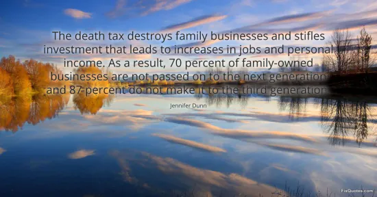 Dunn, Jennifer. "The death tax destroys family businesses and stifles investment that leads to increases in jobs and personal income. As a result, 70 percent of family-owned businesses are not passed on to the next generation and 87 percent do not make it to the third generation." FixQuotes. January 16, 2026. https://fixquotes.com/quotes/the-death-tax-destroys-family-businesses-and-90615/.